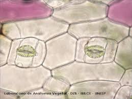 As folhas possuem estômatos que são estruturas existentes na epiderme das folhas, constituídas de duas células guardas. Entre as duas células existe uma abertura chamada de ostíolo. É através deste que a plantas faz as trocas gasosas entre a planta e o meio externo.